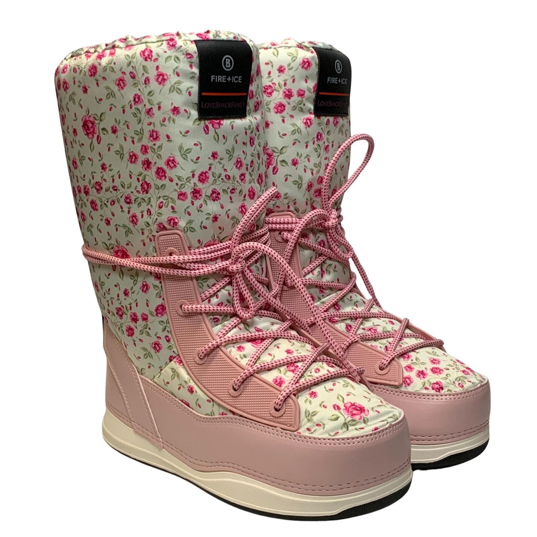 Floral Ski boots from Bogner Fire + Ice in collaboration with Love Shack Fancy. Laced front.